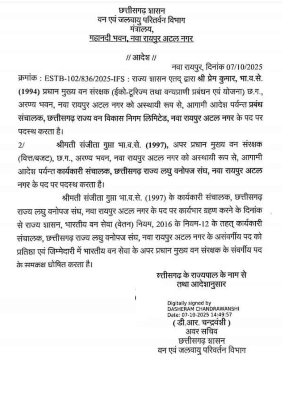 इसी प्रकार आईएफएस संजीता गुप्ता (1997 बैच) को छत्तीसगढ़ राज्य लघु वनोपज संघ का कार्यकारी संचालक नियुक्त किया गया है। दोनों अधिकारियों को यह दायित्व अस्थायी रूप से आगामी आदेश तक सौंपा गया है।