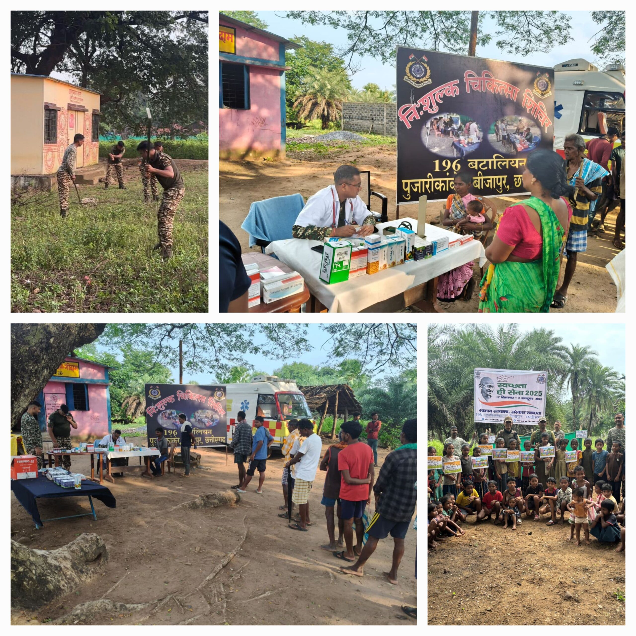 बीजापुर(हिन्दसत)। नक्सल प्रभावित पुजारीकांकेर (उसूर ब्लॉक) में 196वीं बटालियन सीआरपीएफ द्वारा स्वच्छ भारत अभियान के तहत स्वच्छता अभियान और निःशुल्क चिकित्सा चौपाल का आयोजन किया गया। यह कार्यक्रम पुलिस महानिरीक्षक (छत्तीसगढ़ सेक्टर) शालिन, पुलिस उप महानिरीक्षक बी.एस. नेगी और कमांडेंट कुमार मनीष के मार्गदर्शन में संपन्न हुआ।