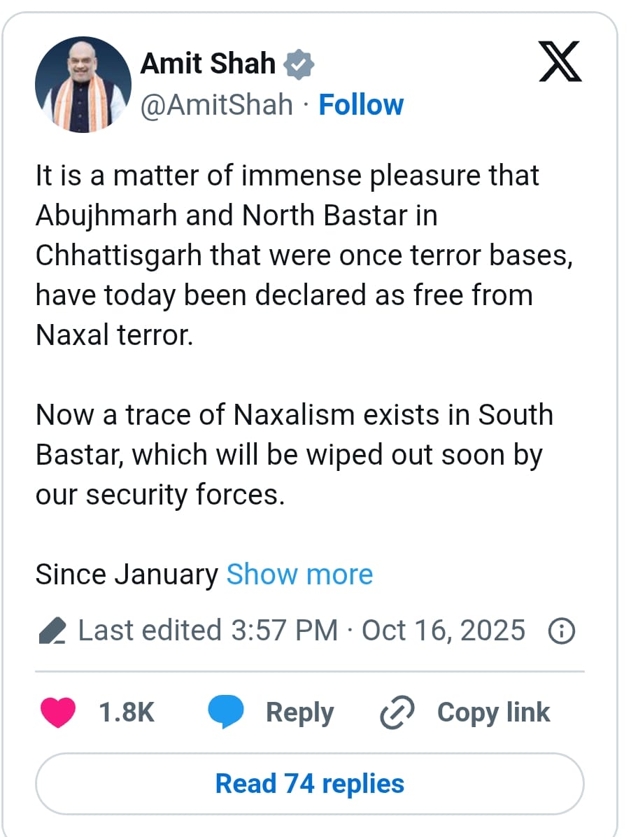 गृह मंत्री अमित शाह ने इसे नक्सलवाद के ख़ात्मे की बड़ी सफलता बताया