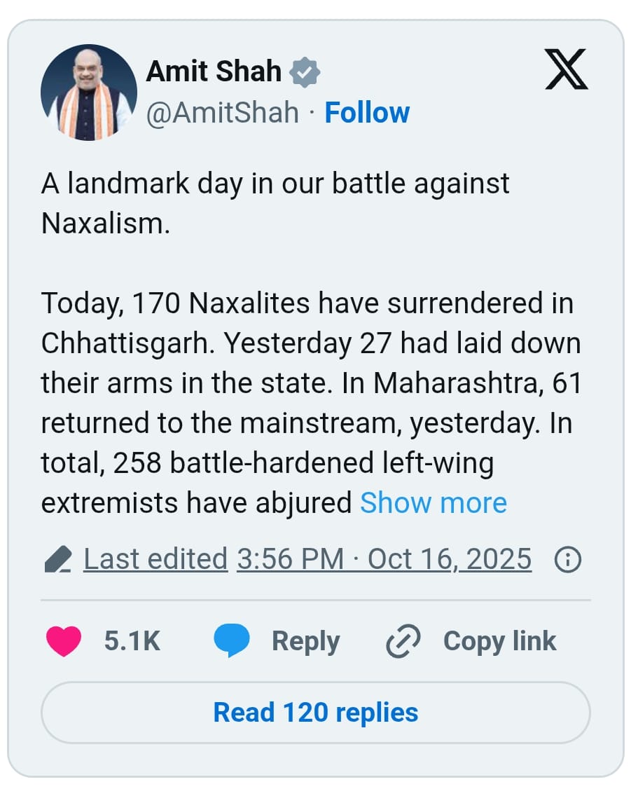 केंद्रीय गृह मंत्री ने X (ट्वीटर) पर ट्वीट करते हुए कहा कि हिंसा छोड़कर देश के संविधान में अपना विश्वास पुनर्स्थापित करने वाले इन सभी निर्णयों की प्रशंसा करते हैं। उन्होंने प्रधानमंत्री नरेन्द्र मोदी के नेतृत्व में सरकार की निरंतर कोशिशों को इसका श्रेय दिया और कहा कि नक्सलवाद अब “आखिरी साँसें” ले रहा है।