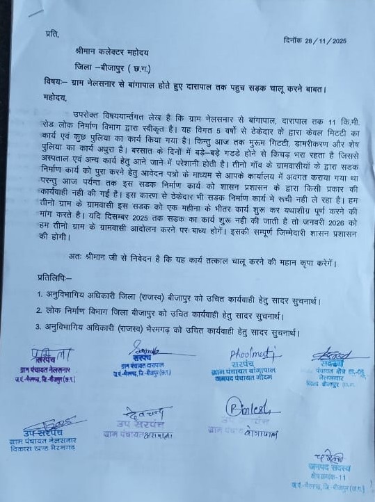 ग्रामीणों ने बताया कि कई बार कलेक्टर कार्यालय को आवेदन दिया गया, लेकिन अब तक प्रशासन द्वारा कोई कार्रवाई नहीं की गई है। आरोप है कि ठेकेदार भी प्रोजेक्ट में रुचि नहीं ले रहा। नेलसनार, दारापाल और बांगापाल के सरपंचों ने संयुक्त बयान जारी कर चेतावनी दी है कि यदि दिसंबर 2025 तक सड़क निर्माण काम शुरू नहीं होता, तो जनवरी 2026 में तीनों गांव के लोग आंदोलन करने मजबूर होंगे। उन्होंने कहा कि इसकी पूरी जिम्मेदारी प्रशासन की होगी। इस दौरान तीनों ग्राम पंचायतों के जनप्रतिनिधियों सहित सर्व आदिवासी समाज के पदाधिकारी मौजूद थे।