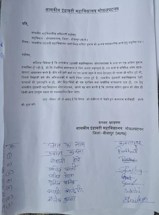 भोपालपट्टनम। बीजापुर जिले के सबसे पुराने शासकीय इंद्रावती महाविद्यालय भोपालपट्टनम के छात्र सोमवार को कॉलेज मार्ग पर स्थित शराब दुकान हटाने की मांग को लेकर सड़क पर उतर आए। छात्रों एवं ABVP छात्र संगठन ने एसडीएम कार्यालय पहुंचकर ज्ञापन सौंपा और प्रशासन से तत्काल कार्रवाई की मांग की।