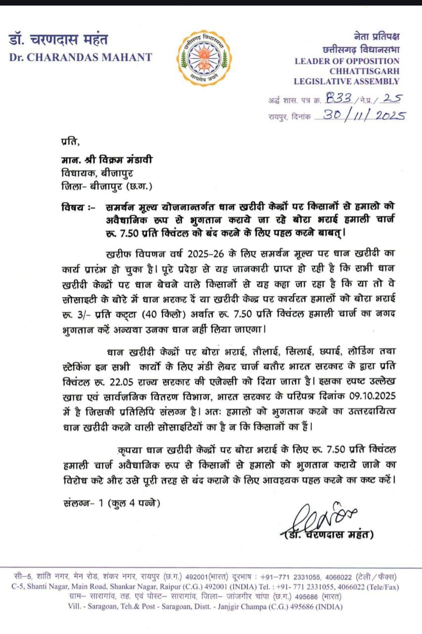 नेता प्रतिपक्ष ने मांग की है कि किसानों से हमाली शुल्क लिए जाने की इस गैर-कानूनी प्रथा का विधायक विरोध करें और इसे सभी धान खरीदी केंद्रों में पूरी तरह बंद कराने आवश्यक कदम उठाएं।