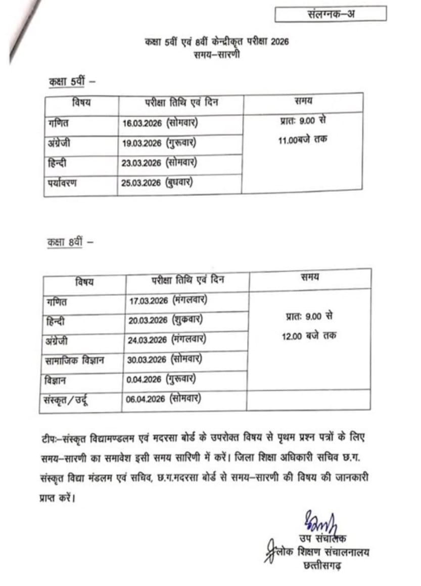 रायपुर (हिन्दसत)। छत्तीसगढ़ की प्राथमिक और माध्यमिक शिक्षा व्यवस्था में इस वर्ष बड़ा बदलाव होने जा रहा है। लोक शिक्षा संचालनालय द्वारा कक्षा 5वीं और 8वीं की वार्षिक परीक्षाओं की समय-सारिणी जारी कर दी गई है, जिन्हें अब बोर्ड पैटर्न पर आयोजित किया जाएगा।
