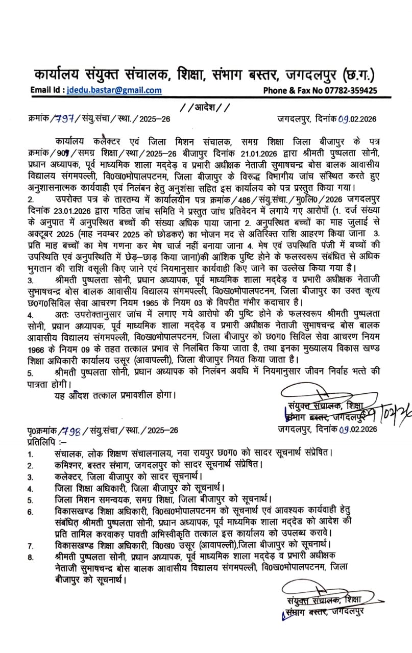मामले की गंभीरता को देखते हुए बस्तर संभाग के संयुक्त संचालक शिक्षा ने चार प्रभारी अधीक्षकों को तत्काल प्रभाव से निलंबित कर दिया है। निलंबित अधीक्षकों में आदित्य ठाकुर, लक्ष्मीनारायण ओढदल, पुष्पलता सोनी और रघुनंदन मौर्य शामिल हैं। प्रशासन ने आगे भी कड़ी कार्रवाई के संकेत दिए हैं।