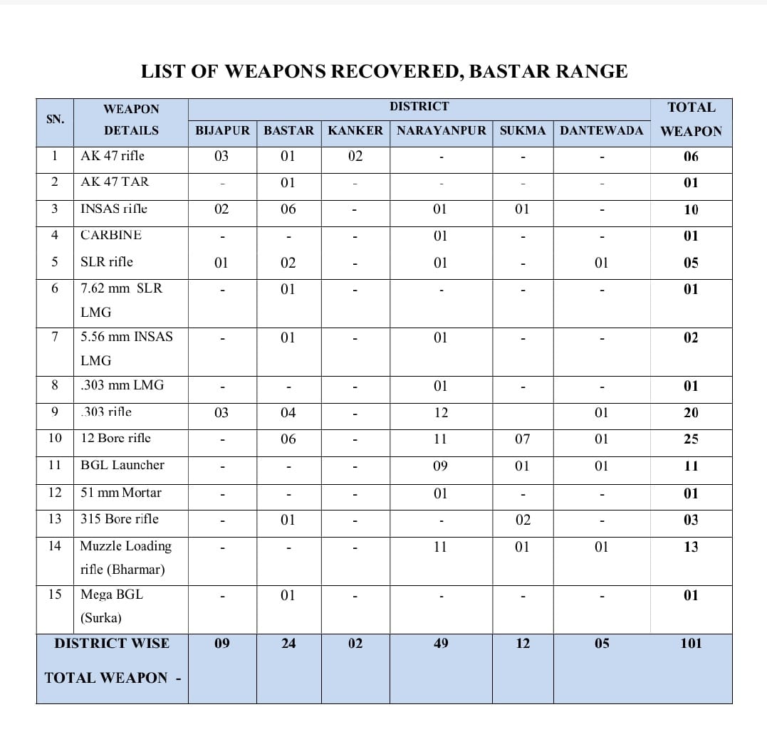 आत्मसमर्पित कैडरों से मिली जानकारी के आधार पर सुरक्षा बलों ने विभिन्न स्थानों पर कार्रवाई करते हुए AK-47, INSAS, LMG, SLR, BGL सहित कुल 101 घातक हथियार बरामद किए हैं। इसके अलावा नक्सल डंप से 3.61 करोड़ रुपये नगद और लगभग 1.64 करोड़ रुपये मूल्य का एक किलोग्राम सोना भी बरामद किया गया है, जिसे नक्सल विरोधी अभियान की बड़ी उपलब्धि माना जा रहा है।