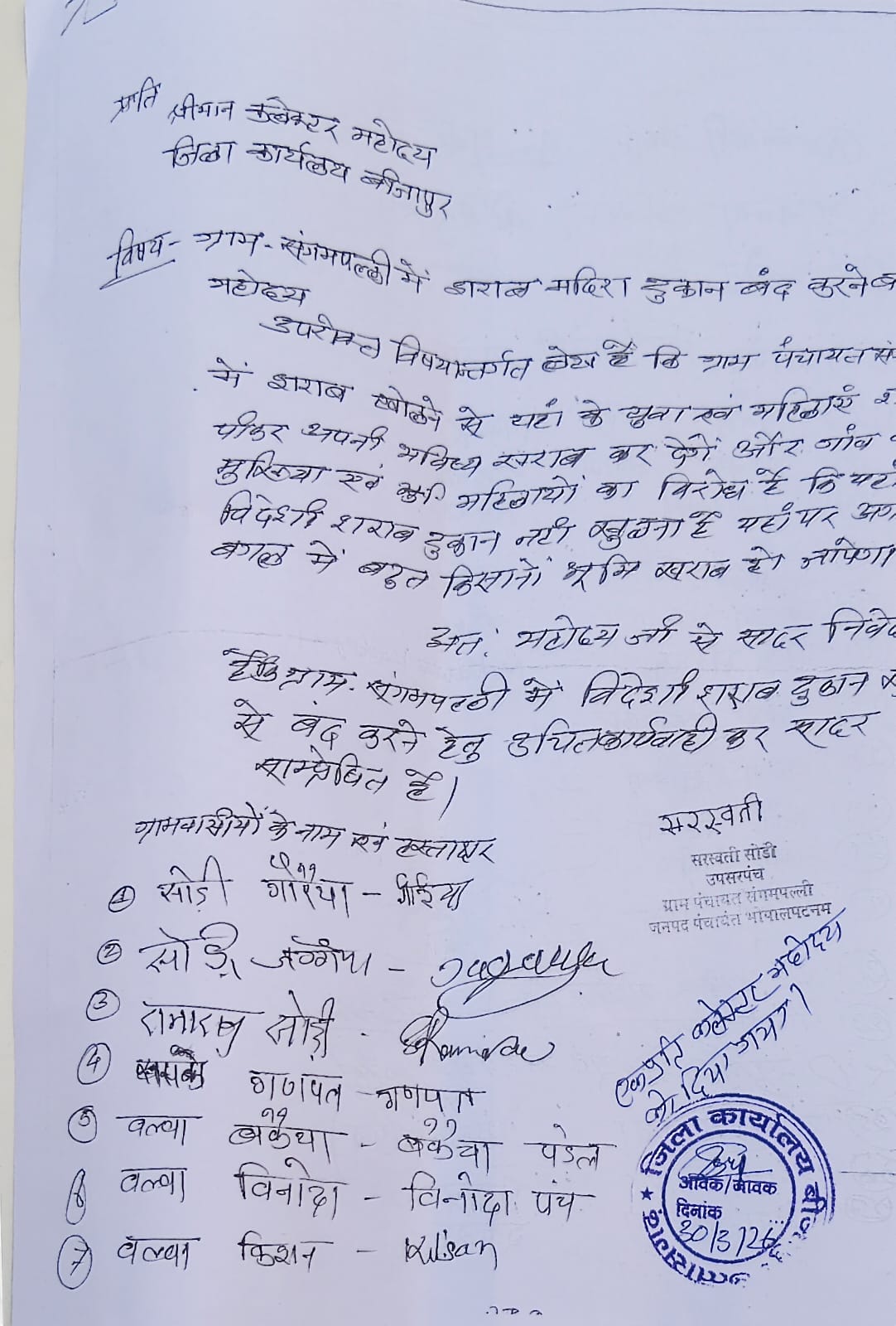 ज्ञापन सौंपने पहुंचे ग्रामीणों में उप सरपंच सरस्वती सोढ़ी, वल्वा किशन, वल्वा विनोदा, सोढ़ी गौरैया, गणपत, वल्वा बकैया, पूर्व सरपंच सुनील उद्दे सहित बड़ी संख्या में महिला-पुरुष ग्रामीण शामिल रहे।