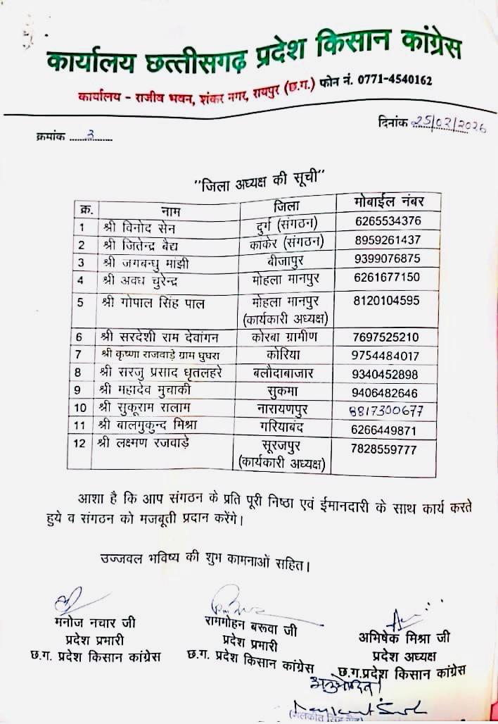 बीजापुर (हिन्दसत)। जिला कांग्रेस कमेटी बीजापुर की ओर से जारी प्रेस विज्ञप्ति के अनुसार वरिष्ठ कांग्रेस नेता एवं किसान जगबंधु मांझी को किसान कांग्रेस जिला बीजापुर का जिला अध्यक्ष नियुक्त किया गया है। यह नियुक्ति छत्तीसगढ़ प्रदेश किसान कांग्रेस के अध्यक्ष अभिषेक मिश्रा, प्रदेश प्रभारी मनोज नचार एवं राममोहन बरुवा द्वारा प्रदेश कांग्रेस के महामंत्री मलकीत सिंह गैदू के अनुमोदन उपरांत की गई है।