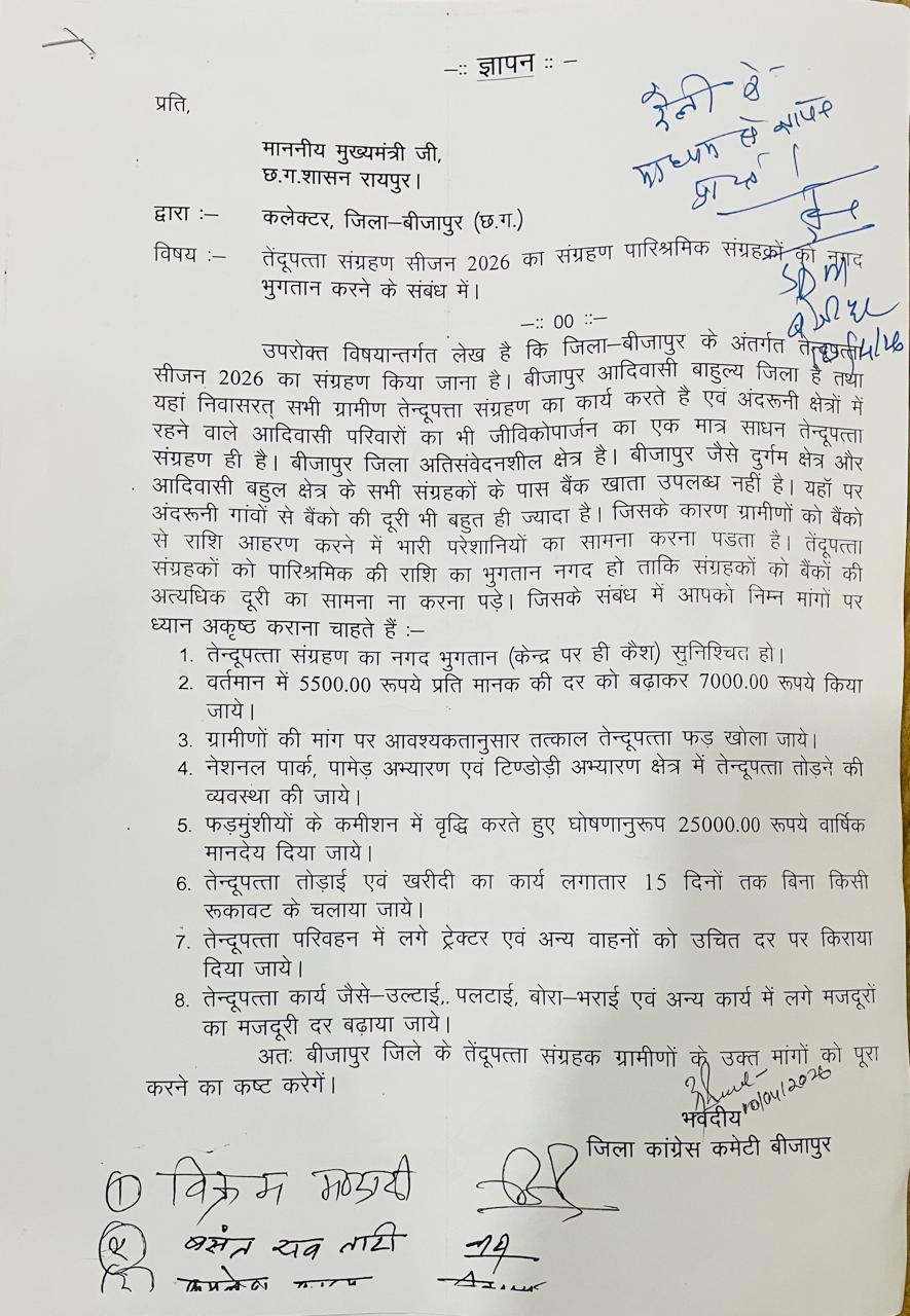 विधायक विक्रम मंडावी ने कहा कि जिले के अंदरूनी क्षेत्रों में रहने वाले गरीब आदिवासी परिवारों के सामने आजीविका का संकट गहराता जा रहा है और रोजगार के अभाव में लोग तेलंगाना एवं महाराष्ट्र की ओर पलायन कर रहे हैं। उन्होंने कहा कि तेंदूपत्ता से मिलने वाली आय आदिवासी परिवारों की आर्थिक रीढ़ रही है, लेकिन भुगतान व्यवस्था बदलने से संग्राहकों को भारी परेशानी का सामना करना पड़ रहा है।