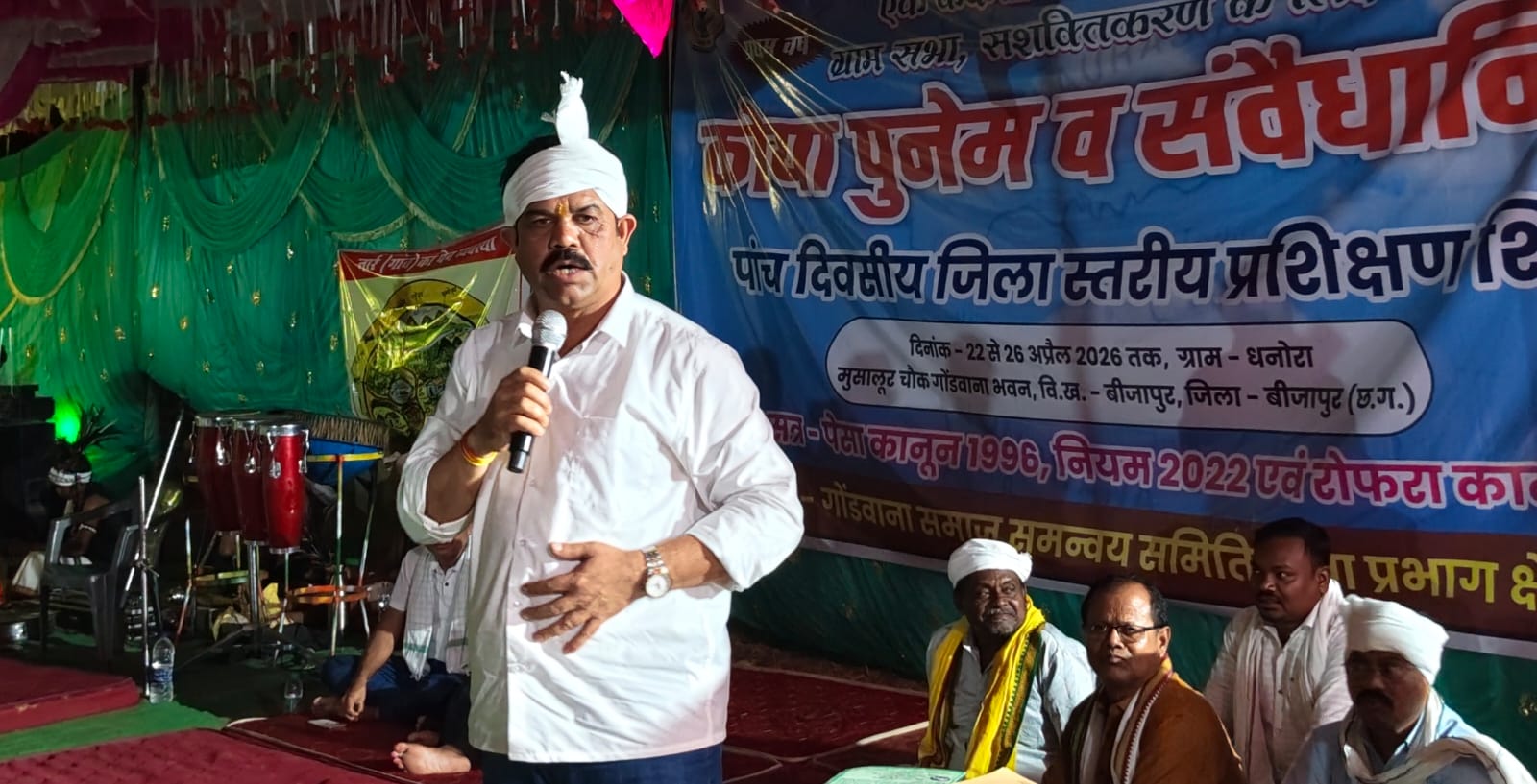 बीजापुर(हिन्दसत)। मुसालूर चौक स्थित गोंडवाना भवन में आयोजित पांच दिवसीय कोया पुनेम संवैधानिक कार्यशाला का रविवार को समापन हुआ। 22 अप्रैल से 26 अप्रैल तक आयोजित इस कार्यशाला में जिले भर से करीब 350 प्रतिभागियों ने भाग लिया। कार्यक्रम का उद्देश्य आदिवासी समाज की पारंपरिक आस्था, संस्कृति और जीवन दर्शन को समझने के साथ-साथ युवाओं को अपनी मूल पहचान से जोड़ना रहा।